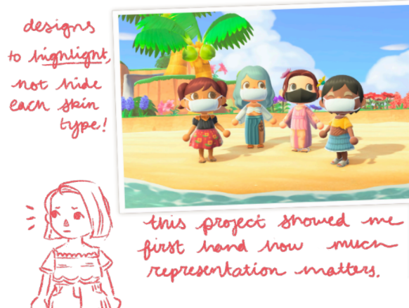 By September I was wrapped up in ACNH again. Autumn and Winter updates brought new life and characters into the game, and I was newly inspired to use digital design in more creative and meaningful ways. On the work front it finally felt like entering the industry was within reach. The success of the Skinclusive collection allowed me to speak at the Women in Games Global Conference as well as work with additional companies, including Netflix and Tommy Hilfiger.