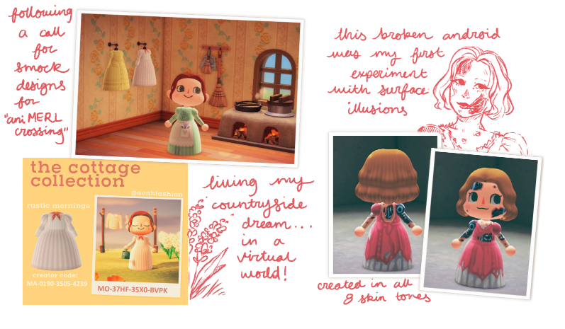 Soon after the game’s launch I started a twitter account to bookmark and share ACNH designs. I knew the game was popular, but I had no idea how active the community would be in those early months. I shared as many designs as I could: a broken cyborg, trending cottagecore looks, rural smock designs for the MERL [Note: The Museum of English Rural Life – in the context of an Animal Crossing Smock Challenge]. I took design requests, collaborated with friends, and was constantly chatting to people from all around the world, connected through our enthusiasm for the game.